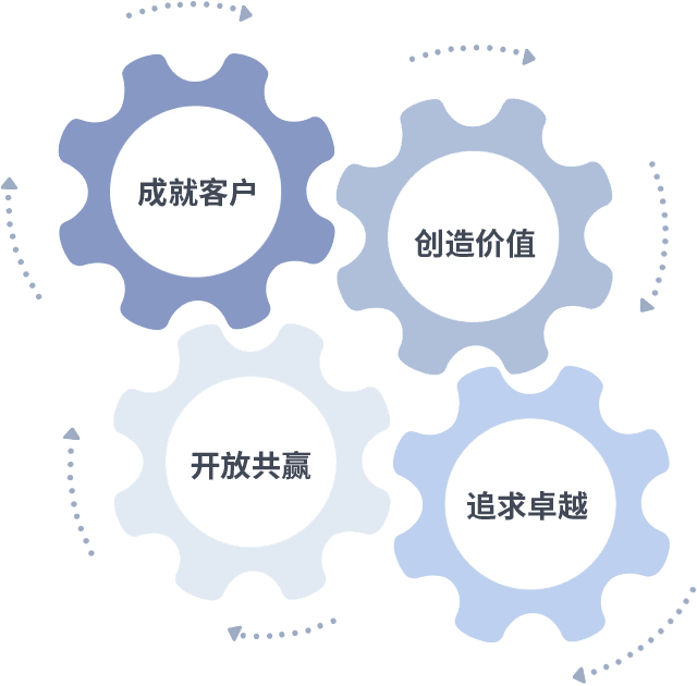 成就客户是一切决策的出发点,,,,创造价值是衡量所有工作的标准,,追求卓越是我们做事做人的态度,,,,开放共赢是我们的格局也是最终的结果。。价值观的齿轮环环相扣,,,,推动着组织里的每个人不断向前。。。